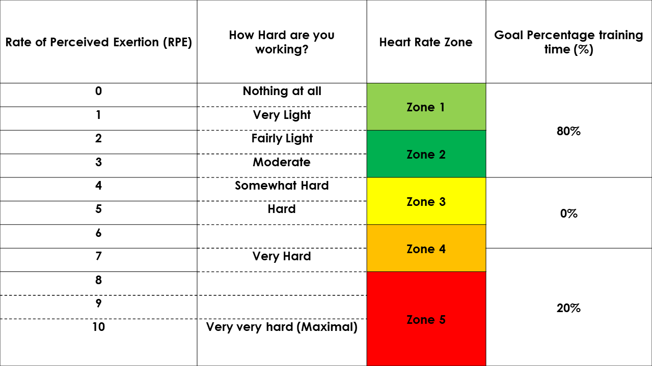 The table below outlines how to gauge your training intensity and defines the split required for polarised training. The heart rate zones refer to the heart rate zones we use following an incremental exercise test in our laboratory. You can however either use heart rate or rating of perceived exertion (RPE) to gauge your effort during the HIT training.
